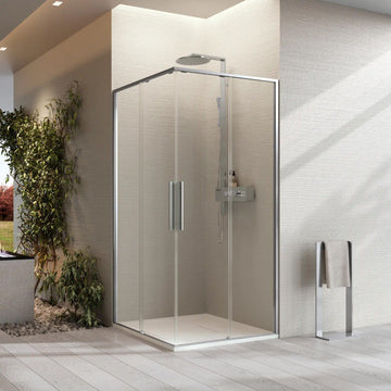 Skyvedør i sort matt for hjørnemontering sammen. Den praktiske styrebraketten gjør det lettere å rengjøre ved å frigjøre døren fra det faste feltet. Med 1,5 cm justering på profilene kan du tilpasse installasjonen etter behov. Herdet sikkerhetsglass på 6 mm.