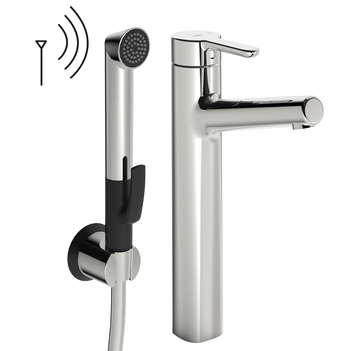 Funksjonen til fjernstyrt Smart Bidetta hånddusj: Når du løfter hånddusjen fra holderen, begynner vann å renne fra kranen. Når du trykker på knappen på hånddusjen, veksler den over så vannet kommer ut av hånddusjen. Når du plasserer Smart Bidetta-hånddusjen tilbake til holderen, stenges kranen automatisk.
