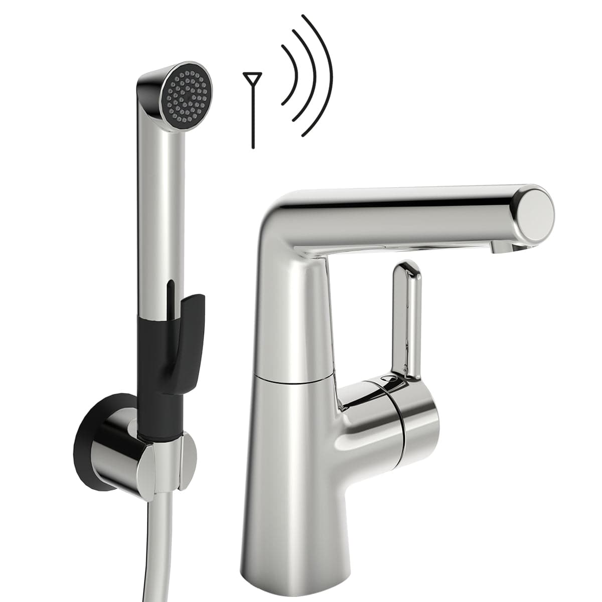 Funksjonen til fjernstyrt Smart Bidetta hånddusj: Når du løfter hånddusjen fra holderen, begynner vann å renne fra kranen. Når du trykker på knappen på hånddusjen, veksler den over så vannet kommer ut av hånddusjen. Når du plasserer Smart Bidetta-hånddusjen tilbake til holderen, stenges kranen automatisk.