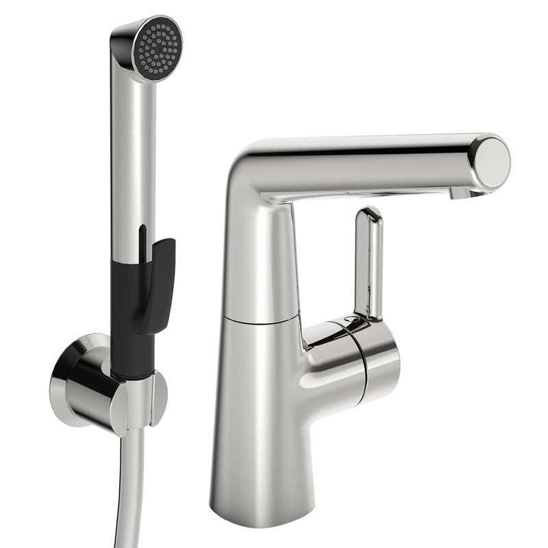 Servantkran med sidehendel og svingbar tut samt Smart Bidetta. Tutens svingradius er fabrikkinnstilt ved 120 ° (kan begrenses til 60 °-0°). Enkel installasjon med Oras 3S-installasjonssystem. F = fleksible slanger