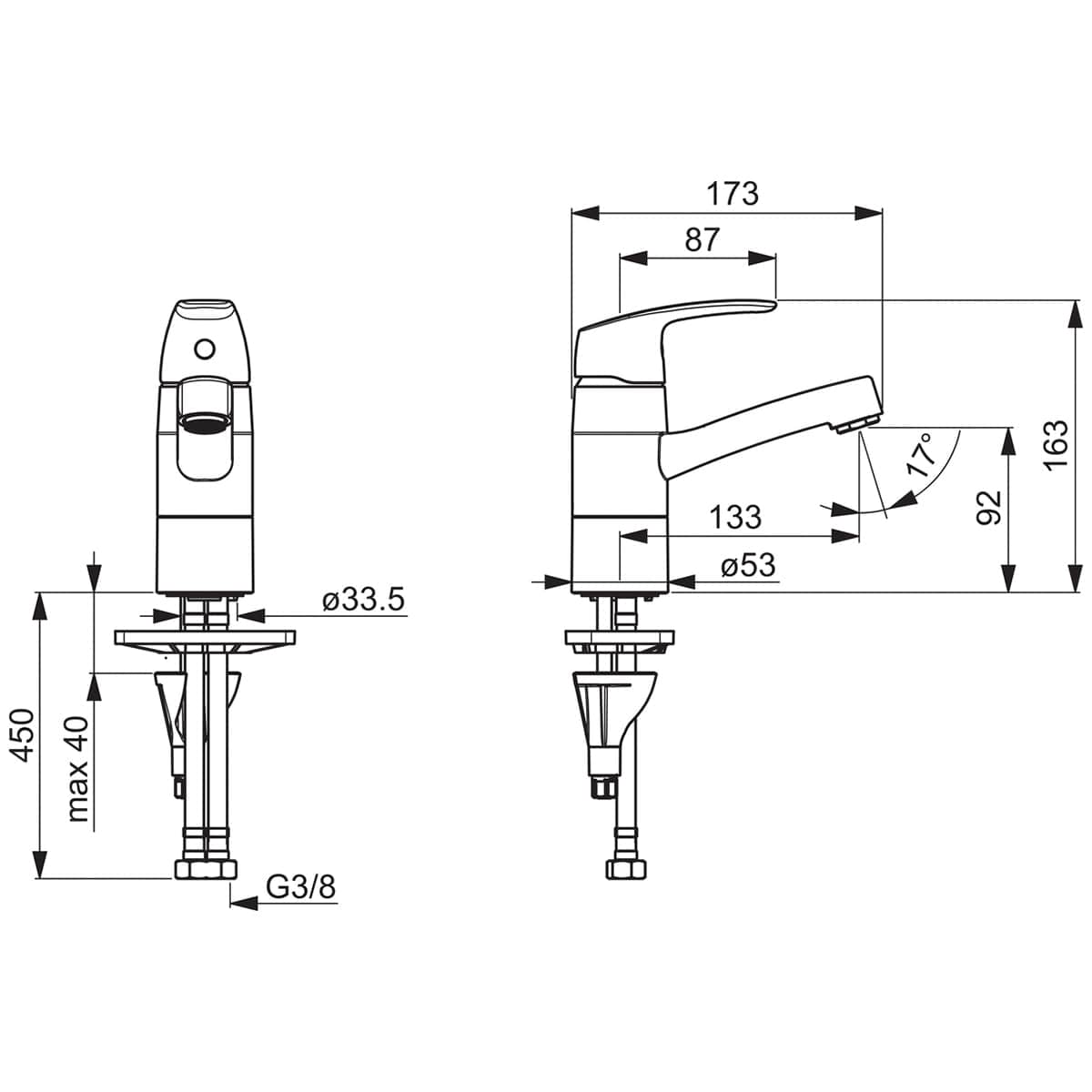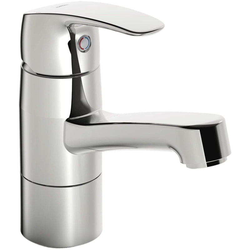 Servantkran. Svingbar tut (125 mm). Tutens svingradius er forhåndsinnstilt på 120° (kan begrenses til 40° - 80°). Det er også innebygd alternative begrensninger for vanntemperatur og maksimal vannmengde.