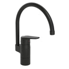 Kjøkkenkran i matt sort, med høy svingbar tut, strålesamler og keramisk avstengning for oppvaskmaskin (ON/OFF). Tutens svingradius er fabrikkinnstilt på 120° (kan begrenses til 40–80°). Justerbar sokkel som gjør at tuten monteres bak, til høyre eller venstre på krankroppen ved installasjon. Hendelen er utstyrt med en økoknapp som kan begrense vannmengden. Funksjonen oppheves enkelt ved trykke på knappen. Sikker i bruk og vannbesparende. Oras 3S-Installation for enkel, sikker og rask montering. F = fleksible slanger.
