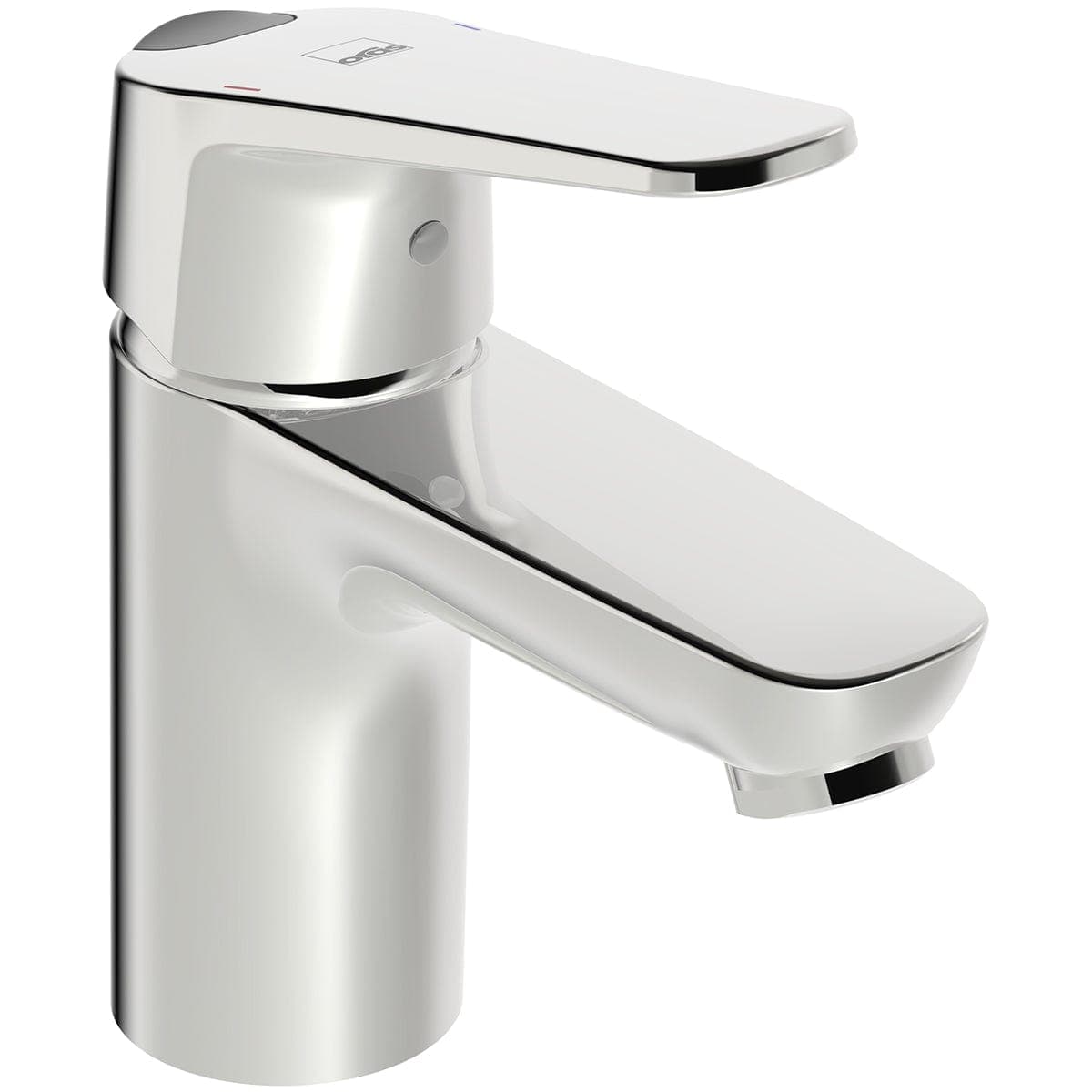 Servantkran. Hendelen er utstyrt med en økoknapp som kan begrense vannmengden og temperatur. Funksjonen oppheves enkelt ved trykke på knappen. Sikker i bruk og vannbesparende. Høyde: 15,1 cm.