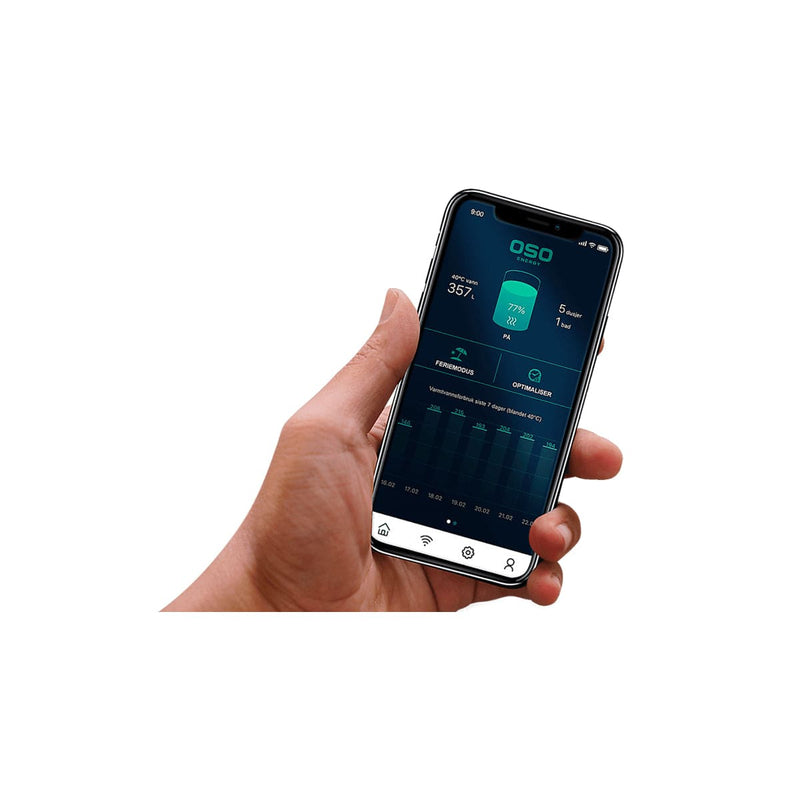 For å styre OSO Charge laster du ned appen OSO InCharge. Denne er utviklet med et brukervennlig grensesnitt, og gir brukeren innsikt i varmtvannsnivå. I appen kan du enkelt aktivere smartstyring, og følge med på historiske forbruksdata.