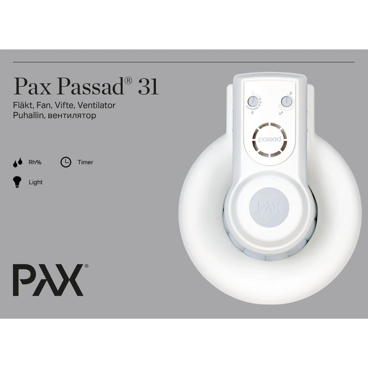 Pax Passad 30 er funksjonsrik vifte og en god ventilasjonsløsning i rom med naturlig selvtrekk eller i hus hvor det mekaniske avtrekkssystemet trenger tilskudd. Kan utstyres med tilbehøret kaldrasspjeld for montering i yttervegg. Allpolig bryter er tilgjengelig for ettermontering.