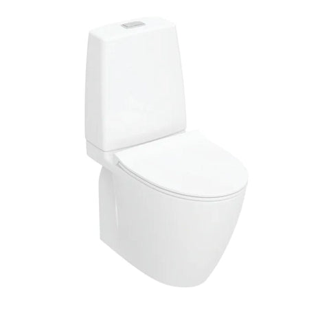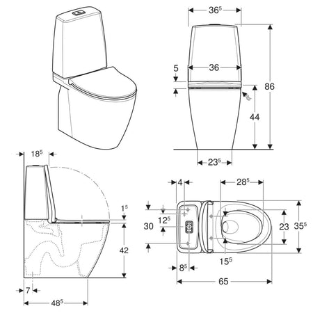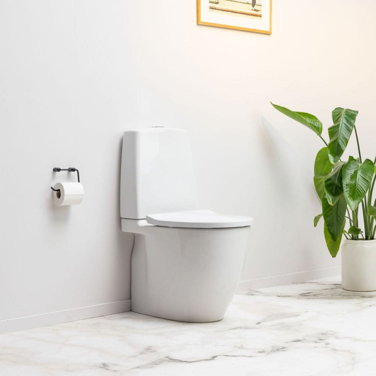 Gulvstående toalett med skjult S-lås, for liming. Toalettet har en dobbeltskyllefunksjon på 2/4 liter, som enkelt kan justeres til 3/6 liter ved hjelp av betjeningsknappen. Effektiv skylling og støyvakt med TurboFlush.