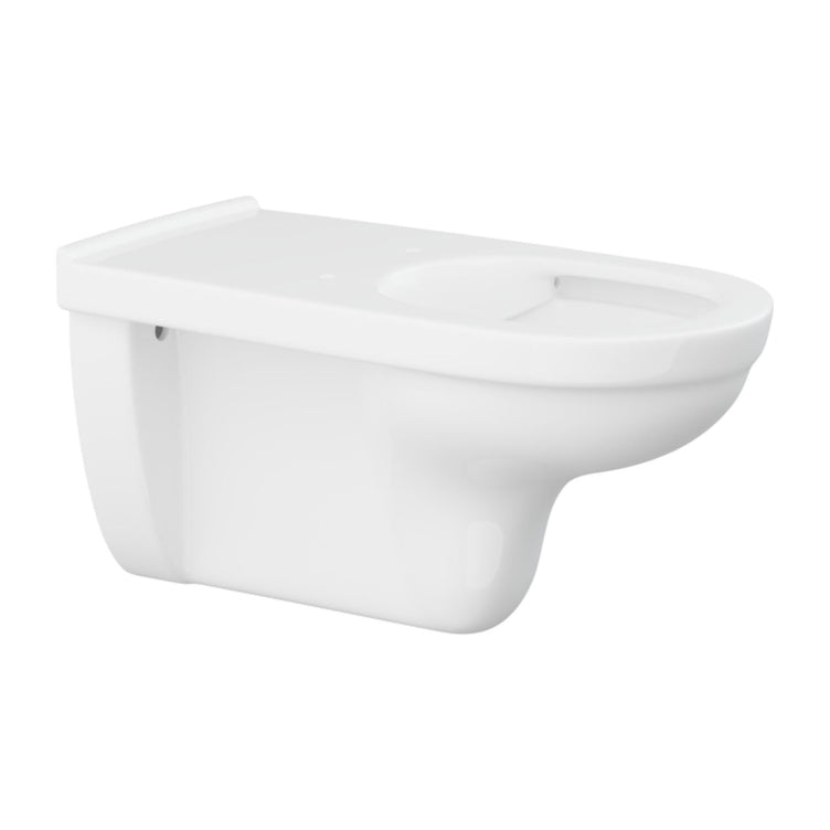 Et væghængt toilet giver mulighed for montering i individuel højde. Nedenunder er der plads til kørestolsbrugerens fodstøtter, mobilliftens ben og hjælperens fødder.