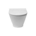 Vegghengt toalett i sanitærporselen, rimless (åpen spylekant) inkl. slim toalettsete med soft-close. Plassbesparende kompakt modell som bygger mindre ut i rommet.