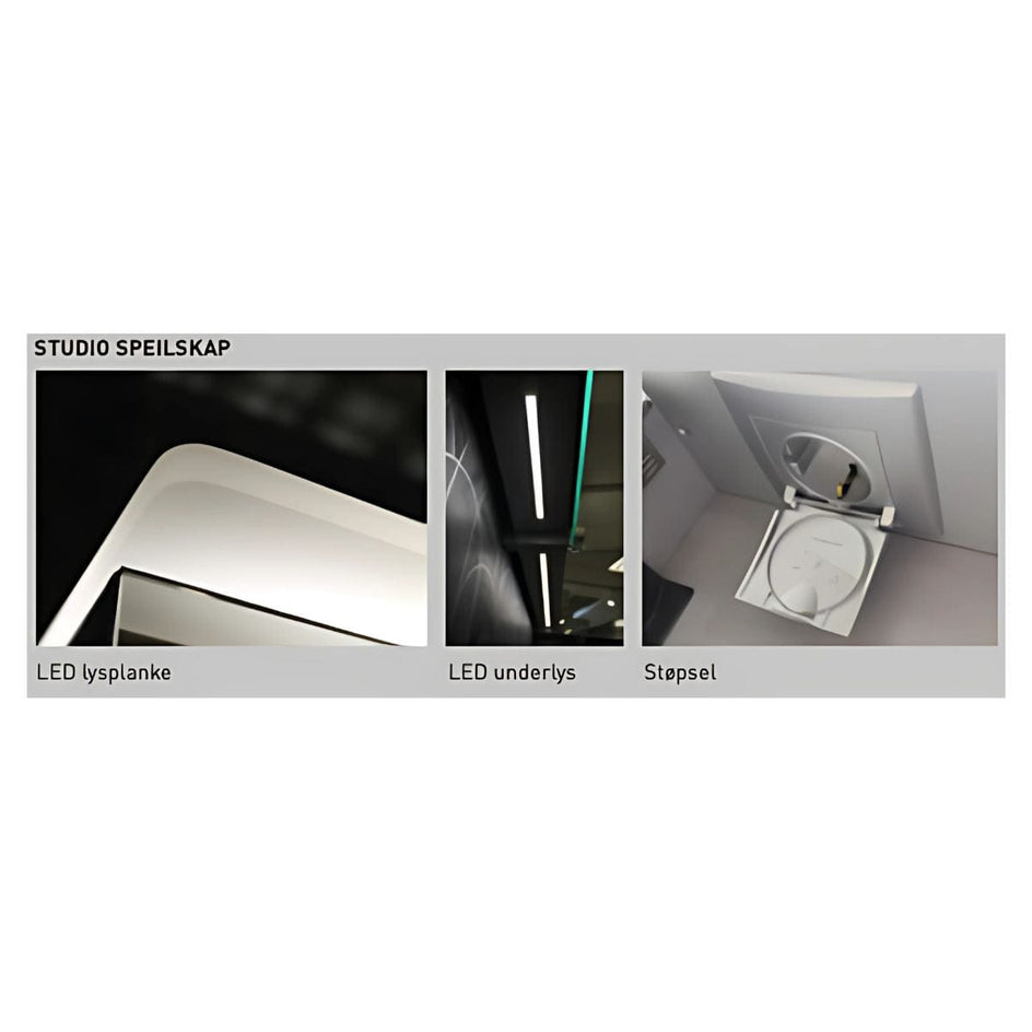 Studio speilskap har alt du trenger for smart oppbevaring, lekker design og utsøkt kvalitet. Speilskapet har speil både på innside og utside på dørene, stikkontakt, en lekker lystopp, og lys ned mot servant, samt masse av plass til oppbevaring. Studio Speilskap leveres med samme farge som på resten av baderomsmøblet.