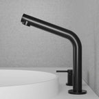 Servantbatteri med separat tut og håndtak. Stilrent, minimalistisk design og praktisk utforming, Passer perfekt til innfelte servanter og nedsenkede servanter for ekstra armslag. Avstand og vinkel mellom håndtak og tut kan tilpasses etter personlig smak og behov.