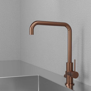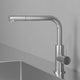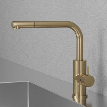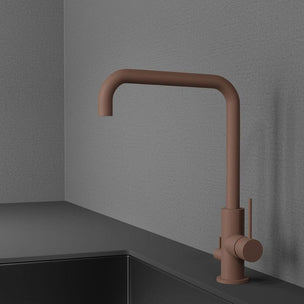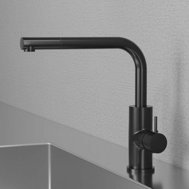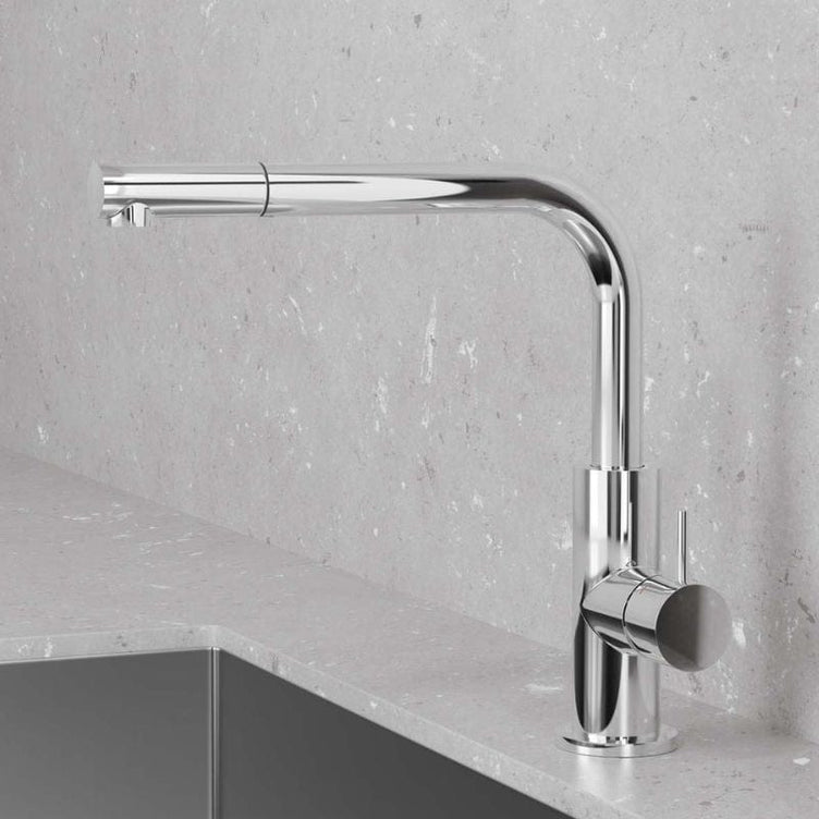 Kjøkkenarmatur med slank form og uttrekkbart munnstykke. Moderne design som skiller seg ut på grunn av tutens vinkel på nittigrader. Designet forenkler montering i f.eks. kjøkkenmiljøer med lave hyller eller overskap.