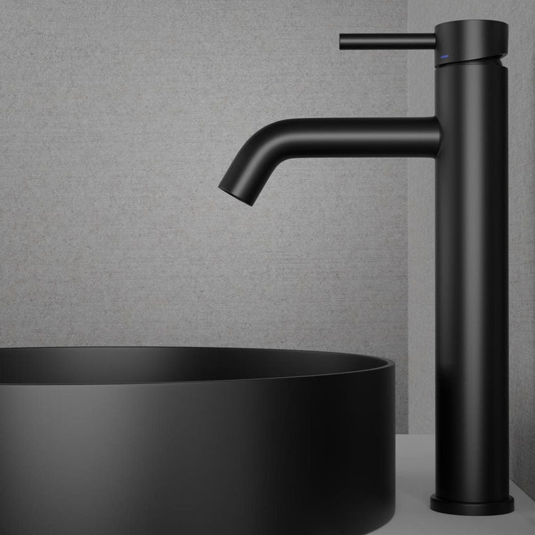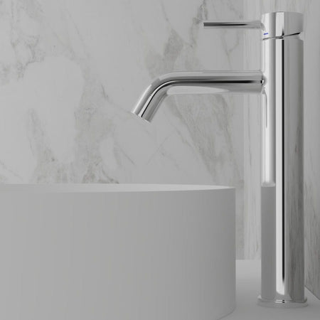 Blandebatteri med myke former og rene linjer der moderne innslag samspiller med klassiske. En høy modell uten skjøt som passer utmerket til frittstående servanter.