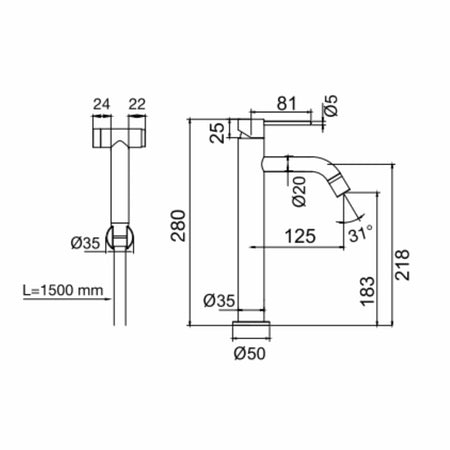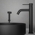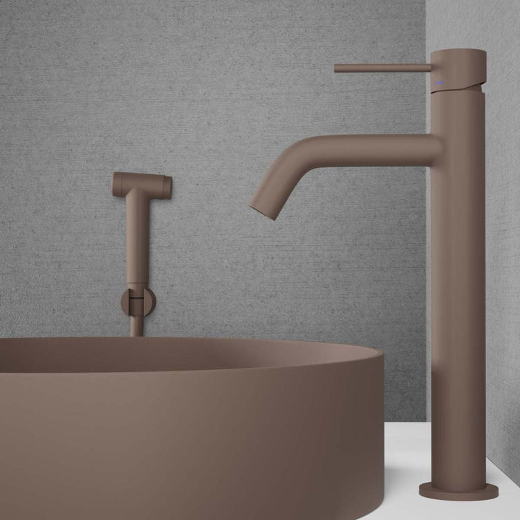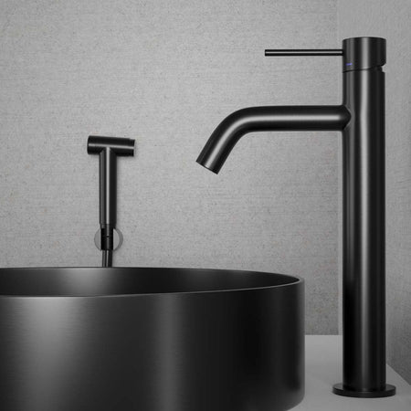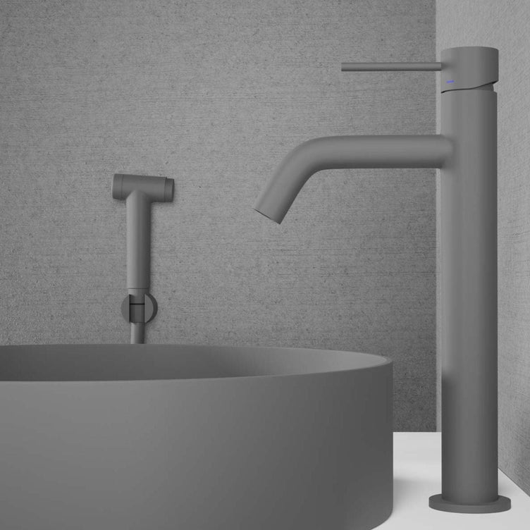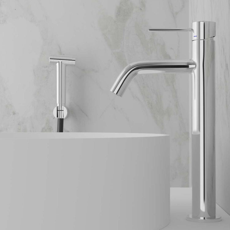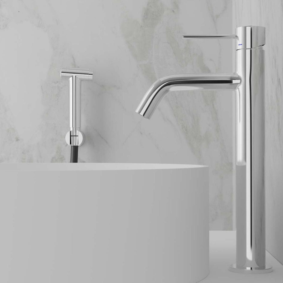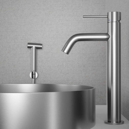 Servantbatteri med bidéfunksjon i rustfritt stål. Samme stilrene design som Voyage, utstyrt med et bidémunnstykke i rustfritt stål. En høy modell uten skjøt som passer utmerket til frittstående servanter. Utstyrt med kvalitetskomponenter som sparer vann og opprettholder en perfekt tilpasset vannstrøm. Utstyrt med kvalitetskomponenter som sparer vann og opprettholder en behagelig, perfekt tilpasset vannstrøm.