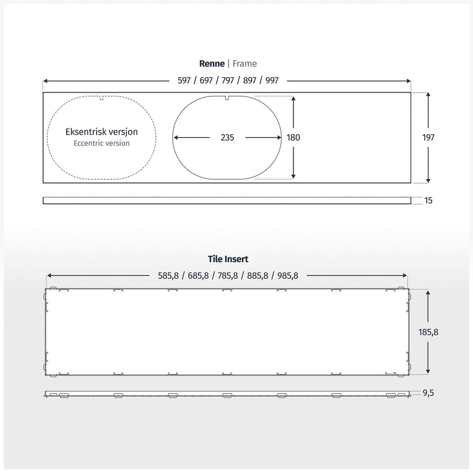 Slidedrain Slukrenne med Tile Insert er en slukrenne til flisbelagt gulv. Rennen har målene 597 mm, 697 mm, 797 mm, 897 mm og 997 mm lengde med 197 mm bredde slik at den passer med modulfliser. Rennen og rist bygger 15 mm høyde og består av 2 komponenter; en ramme og en tile insert til formkuttet flis. Begge komponentene er laget av rustfritt stål.