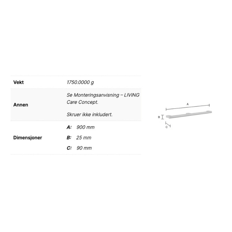 LIVING badekarhåndtak, dobbel. Forkrommet rustfritt stål. Lengde: 900 mm