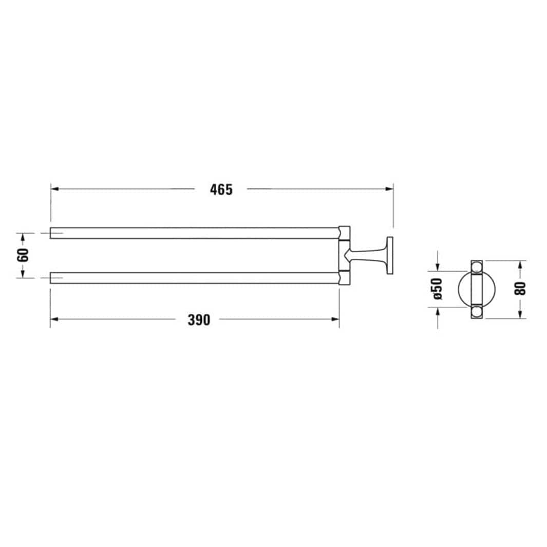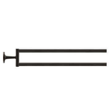 Tiger Noon håndklestang er laget i krom (1321230346), svart matt (1321230746) eller børstet (1321230946) rustfritt stål og har to armer, hver med plass til ett håndkle av normal størrelse. Svingarmene gjør at området rundt servanten kan utnyttes optimalt.