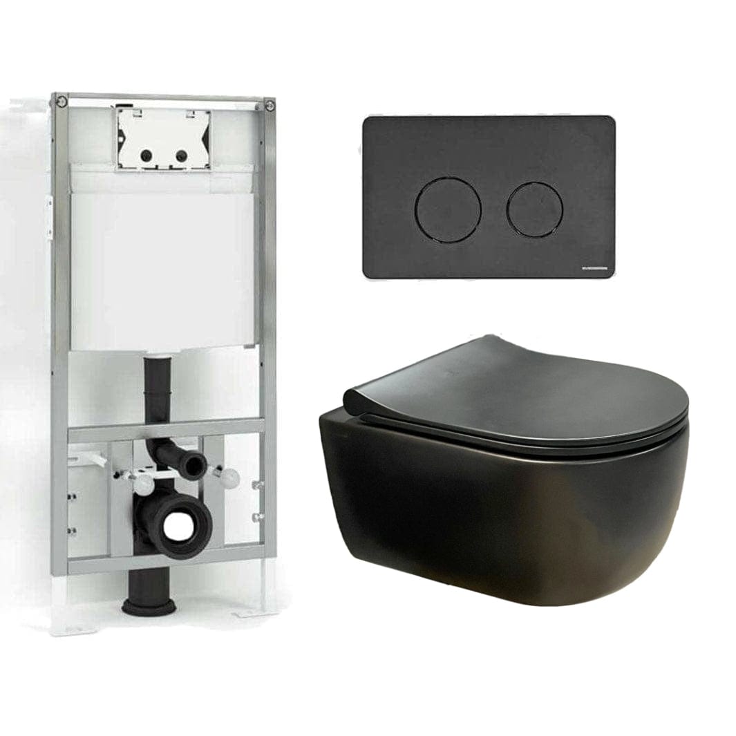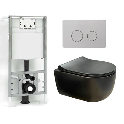 Komplett toalettpakke med innbyggingssisterne, betjeningsplate, svart matt veggtoalett og toalettsete med mykdemping og hurtigfeste
