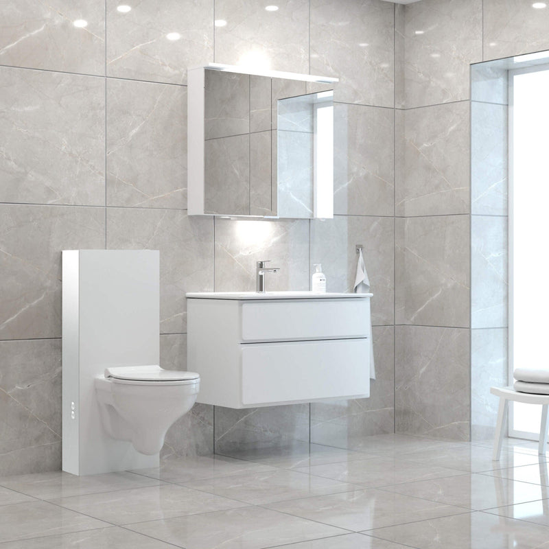 Svedbergs Glassbox er en komplett toalettsisterne for utenpåliggende montering med 6/3 liter spylemengde, en lekker glassfront som hever utseende på baderommet og S-lås for avløp til gulv. Sisternen passer derfor perfekt til deg som har gulvstående toalett, men ønsker å bytte til vegghengt uten alt arbeidet med å bygge inn en sisterne i vegg eller utenpåliggende kasse.