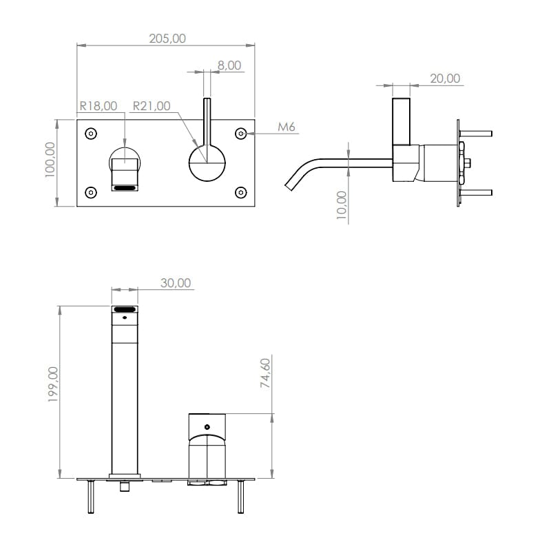Ettgreps blandebatteri for innbygging. Lengde tut 199 mm. Må kombineres med T BOX 2.0 Small.