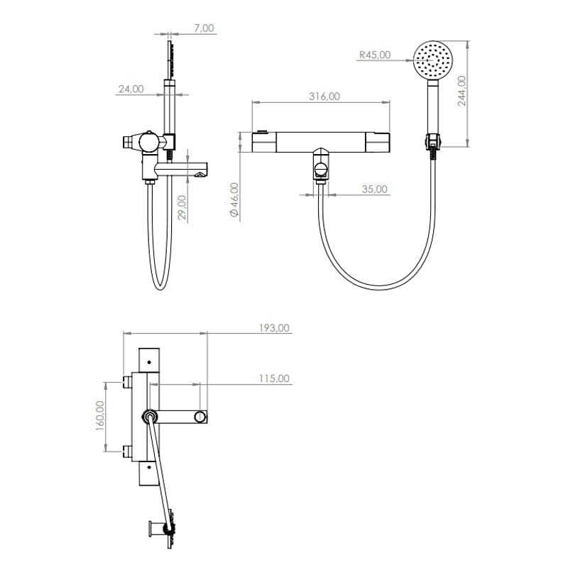 Trykk- og termostatstyrt dusj- og badekarbatteri med svingbar tut, hånddusj, dusjslange og veggfeste.