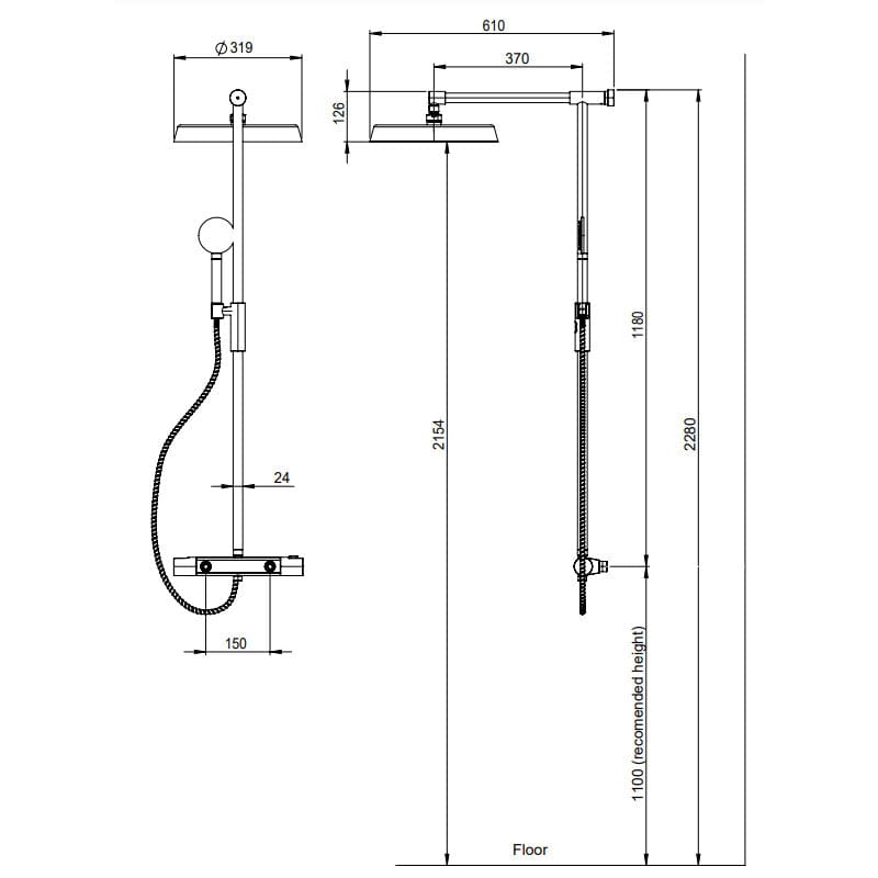 Takdusjpakke med trykkbalansert dusjbatteri. Dusjrøret under veggfestet kan kappes til ønsket dusjhøyde.