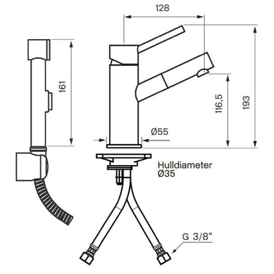 Bidetbatteri med separat hånddusj. Keramisk innsats og fleksible slanger for enkel montering