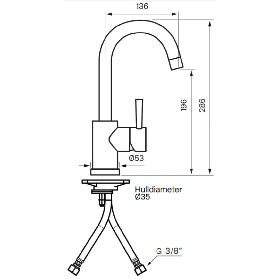 Selv om blandebatteriet ser ut som en høy modell, er det kun 19,6 cm fra bunn til underside tut. Har du en bolleservant med normal høyde på 15-17cm vil du ikke få hendene inn under tuten. I tillegg er tuten kun 13,6cm lang, og vil derfor i mange tilfeller ikke komme tilstrekkelig inn over bolleservanten.
