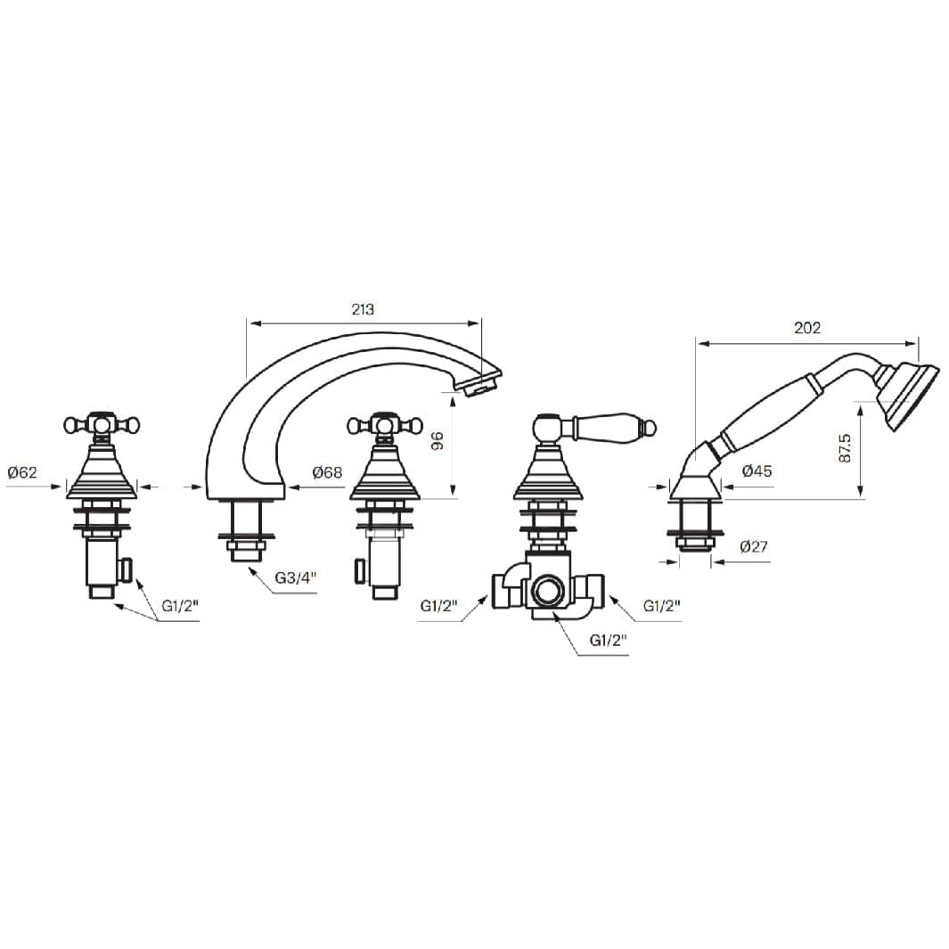 Dusj- og badekarbatteri med hånddusj. 5 hull. For karkantmontering.