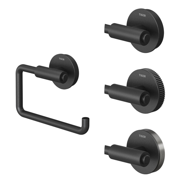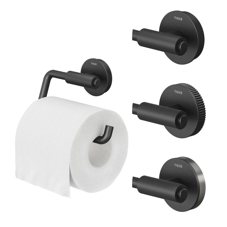 Tiger Orion er en baderomsserie i moderne sort matt utførelse som utmerker seg med sitt stilrene design og muligheten for subtile fargedetaljer ved bruk av dekorringer. Toalettrullholderen leveres med to utskiftbare dekorringer: én med svarte riller og én i fargen gunmetall. For et minimalistisk utseende kan man montere produktet uten dekorring