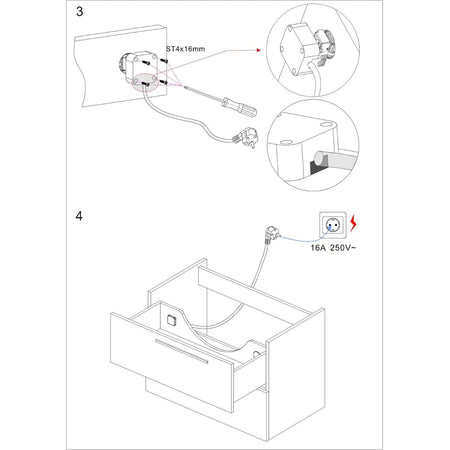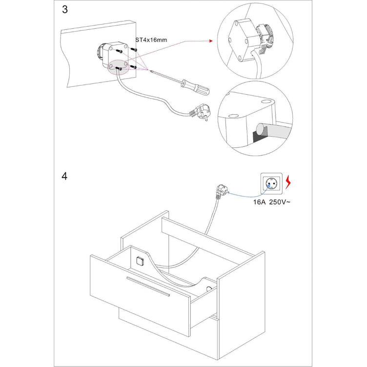 Med stikkontakt i skuffen kan du ha barbermaskinen/hårfønere og lignende apparater liggende i skuff. Dette fører til mindre rot og en trygg oppbevaring. Leveres komplett med 1m ledning med lavt byggende 90graders støpsel til å plugge i veggkontakt